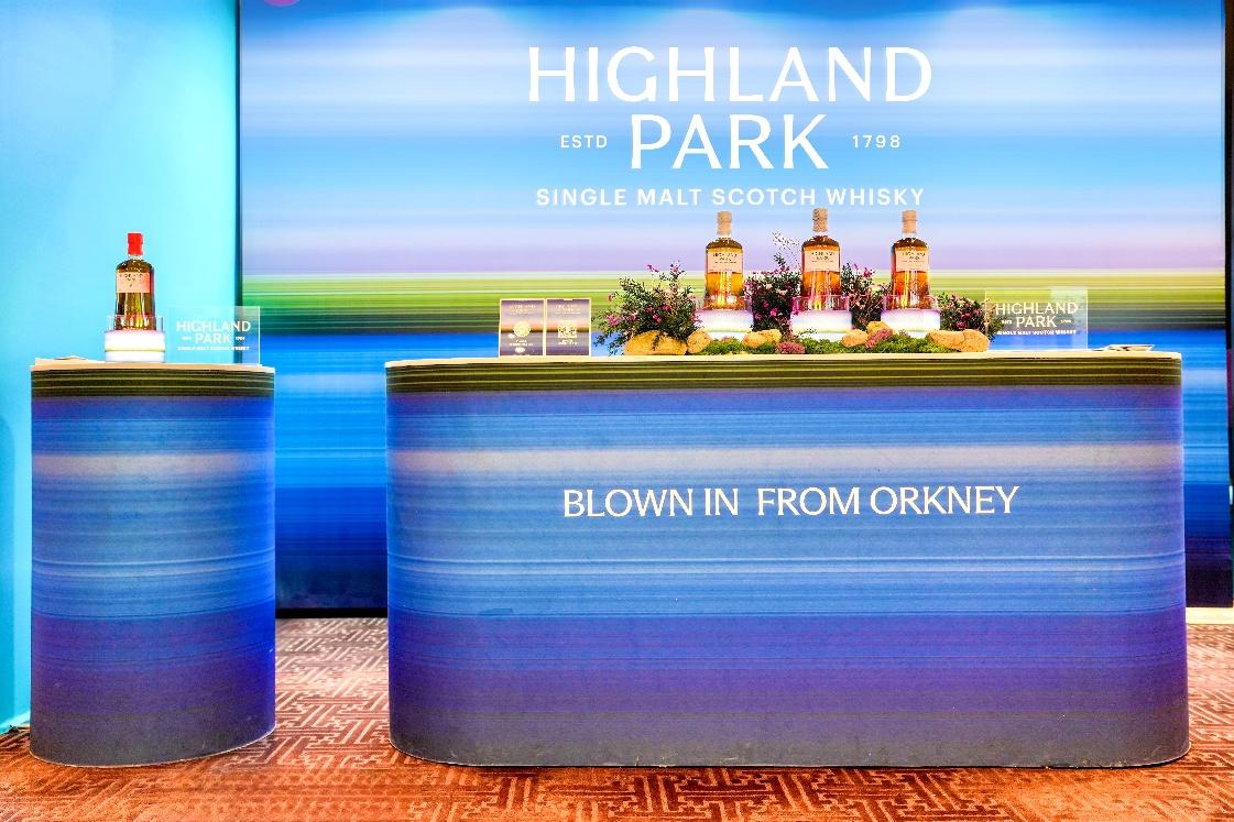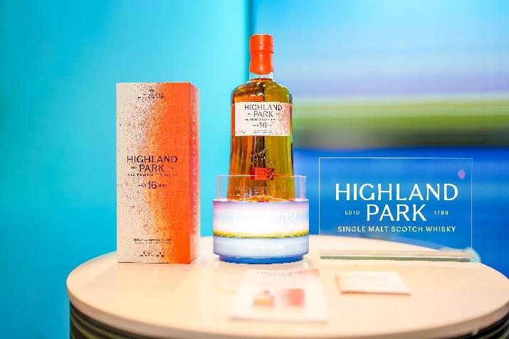 展位设计灵感源自品牌发源地——奥克尼群岛自然景观,通过海洋蓝、荒原翠与天空辽远的色彩交织及欧石楠花,再现岛屿独特风貌。这一沉浸式空间不仅呈现高原骑士12年、15年及18年等获奖酒款,更特别展出与米其林三星名厨Björn Frantzén联袂打造的16年"你我之间"单一麦芽威士忌。