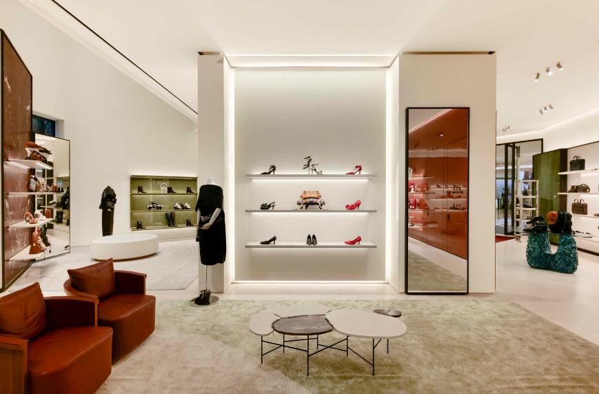 二层空间则汇集了男女成衣、鞋履与配饰系列,并设有私密的贵宾专属空间,提供更为放松、专属的购物体验。同时,此层还设有星光熠熠的典藏展区,呈献典藏限量复刻系列。此外,旗舰店还提供男士经典Tramezza系列手工鞋履的个性化定制服务。客户可甄选优质皮革与最高品质的金属件,并可选刻个人姓名缩写,使鞋履成为独一无二的风格单品,同时全程领略品牌享誉全球的百年匠心工艺。