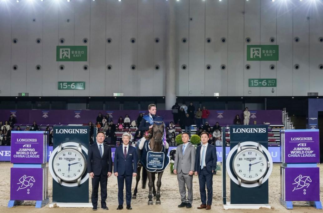 浪琴表中国区销售总监姜斌先生为冠军骑手颁奖合影嘉宾(从左至右):浪琴表国际马联场地障碍世界杯中国联赛执委会执行主席、北京市马术运动协会主席刘诗来,国际马术联合会副主席、国际马术联合会第八区主席黄启芳,中国马术协会秘书长钟国伟,浪琴表中国区销售总监姜斌