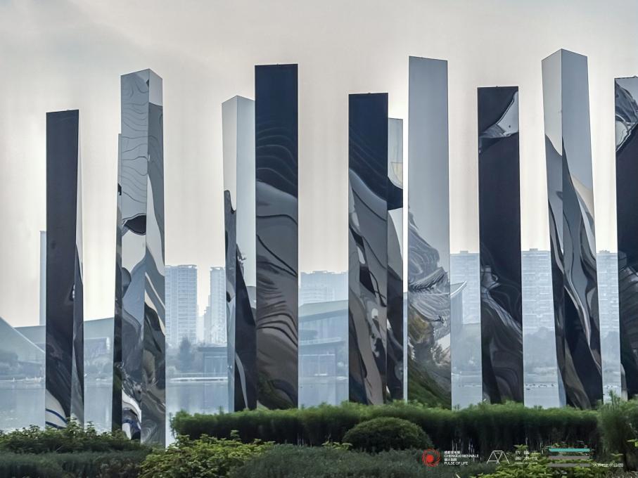 邓乐:《一路风景》亮相A馆湖畔,镜面柱体折射出不断变换日常瞬间。