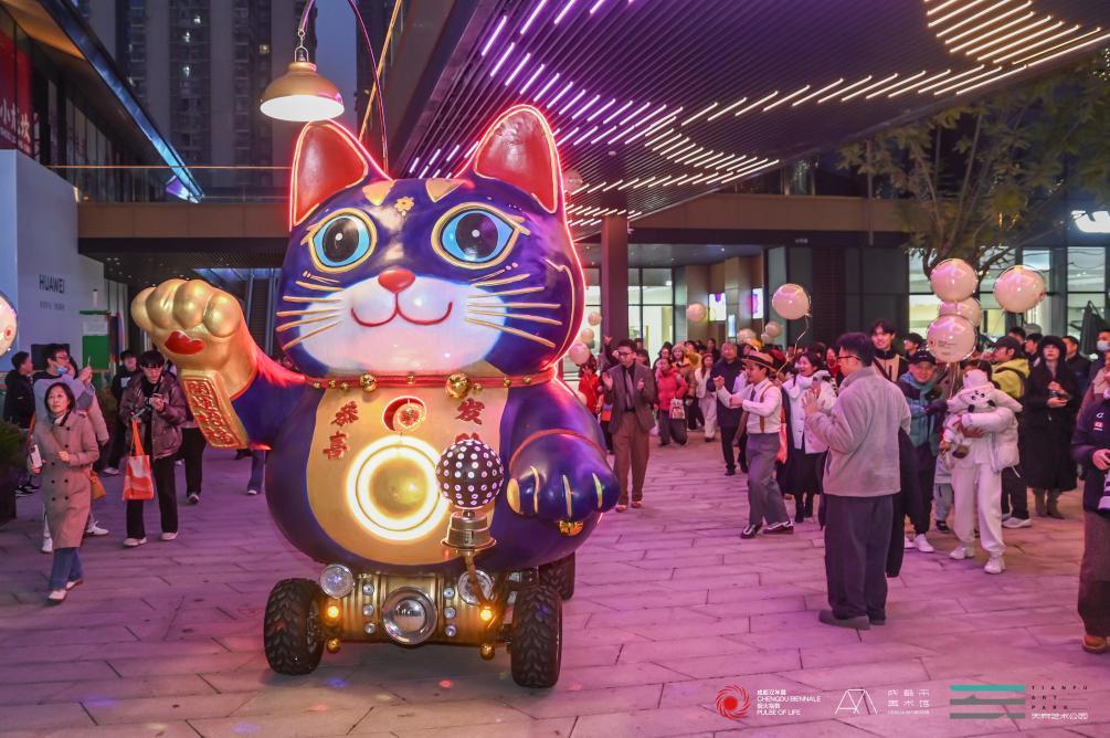 马良+艺奇客:《招财猫》“合影一张,黄金万两”,马良+艺奇客团队的《招财猫》不仅在公园中静态展出,更兼夜间巡游,为市民朋友来带来美好祝愿。
